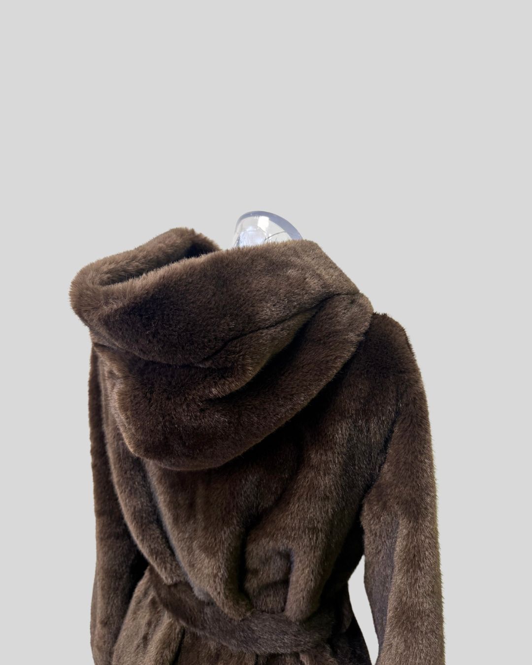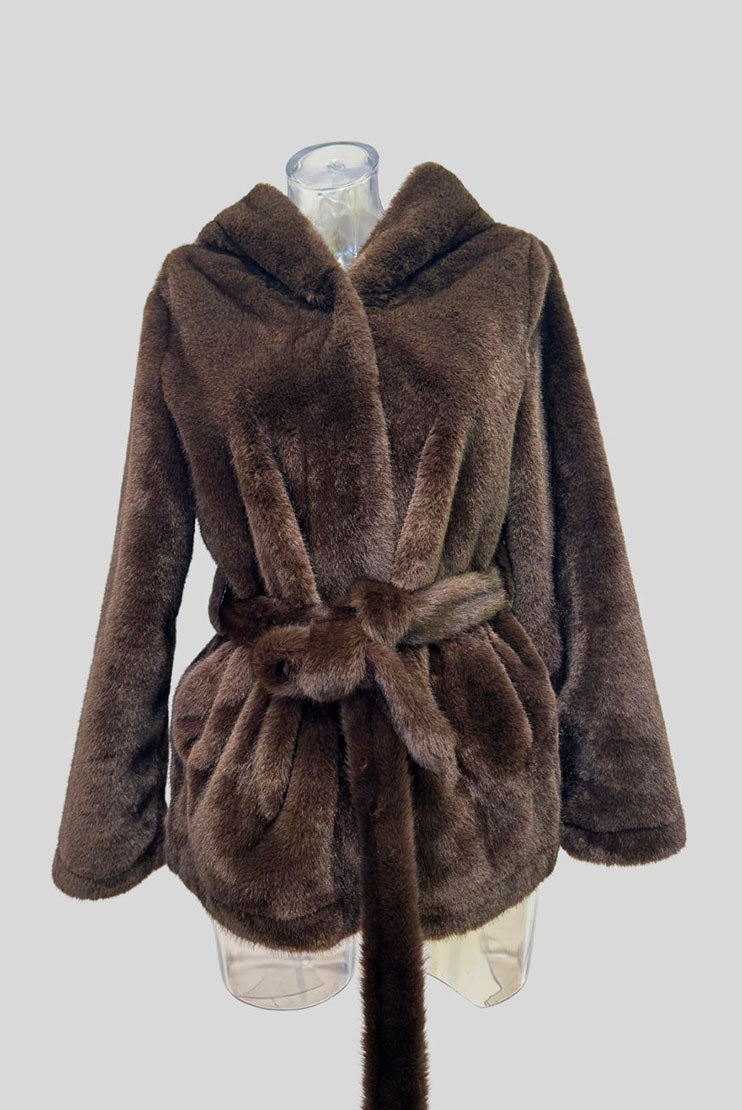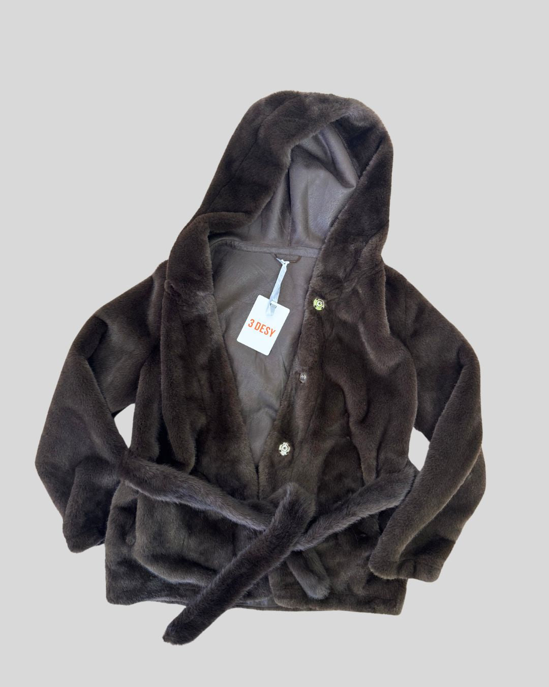 Pelliccia sintetica, morbidissima e calda, con cappuccio e cintura.